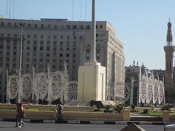走到2011年眾人聚集推翻前總統的解放廣場,被裝飾上計算精密設計的幾何圖形裝飾,